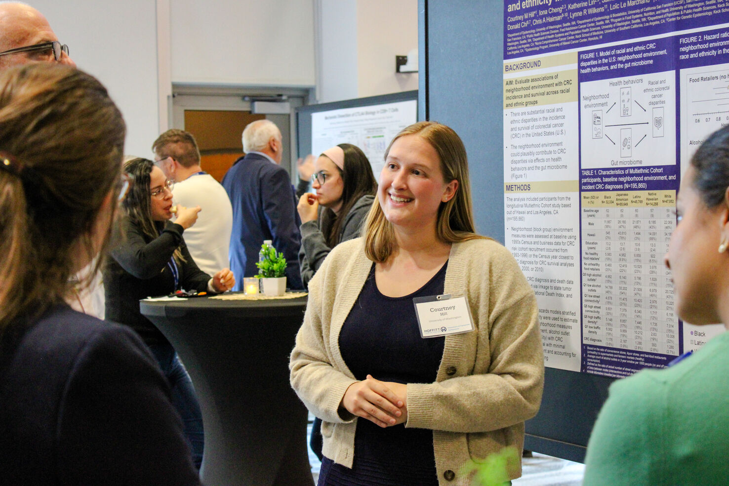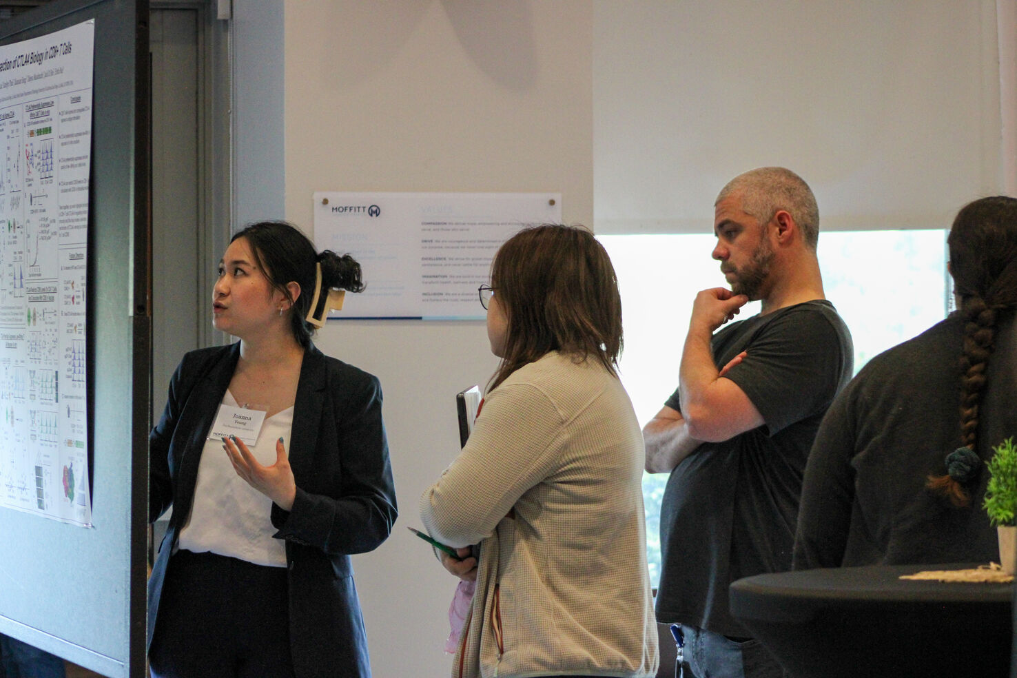 The symposium began with a welcome session and a panel discussion featuring current Moffitt postdoctoral fellows, providing attendees with an inside look at postdoctoral life at Moffitt. After a networking lunch, participants engaged in a professional development workshop led by Dr. Leanna Smithberger, focused on effective communication and articulating professional identity. Day one concluded with a poster session and reception where the 11 attendees showcased their research and exchanged scientific ideas with the Moffitt research community.