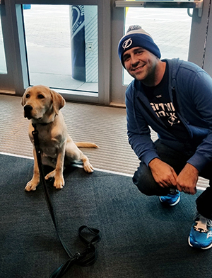 McFarland poses with Bolt, the Tampa Bay Lightning's team ambassador from Southeastern Guide Dogs.