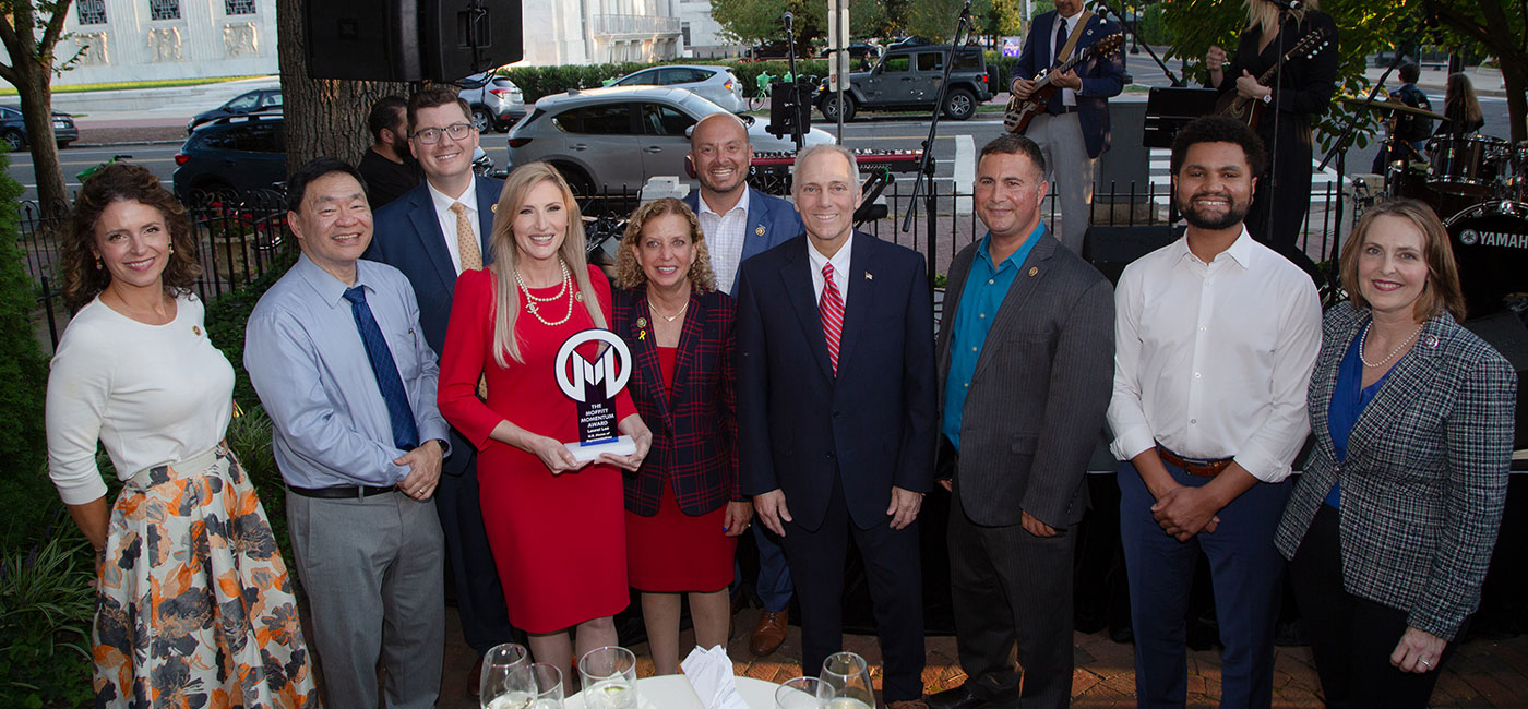 U.S. Rep. Laurel Lee hosted the Moffitt team and members of congress for a lively reception at the Florida House on Capitol Hill to raise awareness and highlight our efforts to address the cancer burden in Florida and beyond. Moffitt’s band, The ReMissions, was thrilled to perform a concert on the outdoor terrace, joined by Congressmen Darren Soto and Maxwell Frost on vocals, guitar and drums. We also honored Congresswoman Lee with the Moffitt Momentum Award for her exceptional support of Moffitt and her dedication to advancing cancer research and patient care in Florida.