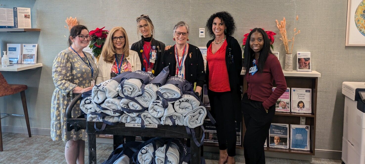 The distribution effort is a collaborative process. Patient and Family Advisory Program advisors prepare the blankets in advance, while Moffitt leaders, advisors and team members join forces to personally deliver them.