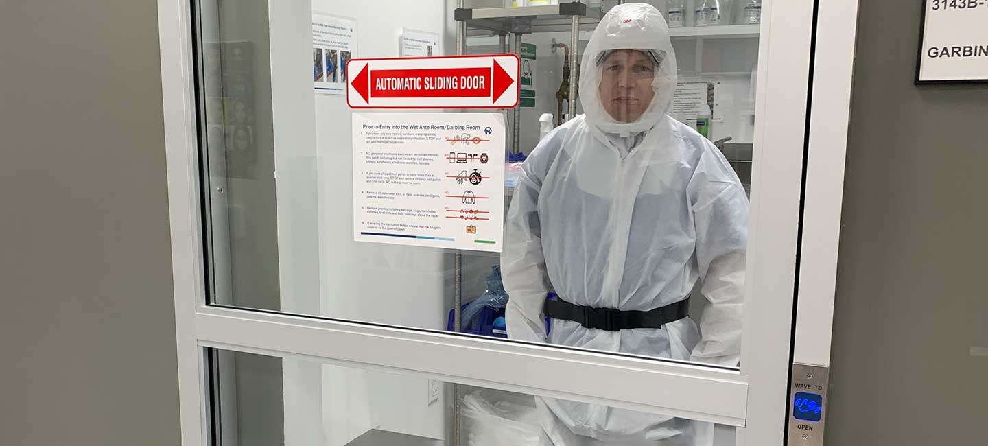 Before crossing the threshold into the infusion pharmacy, the team members step on a sticky floor pad to eliminate possible contaminants from their shoes. Using proper procedures for donning and doffing protective personal equipment, they step in their suits, cross into the sterile environment and begin cleaning.