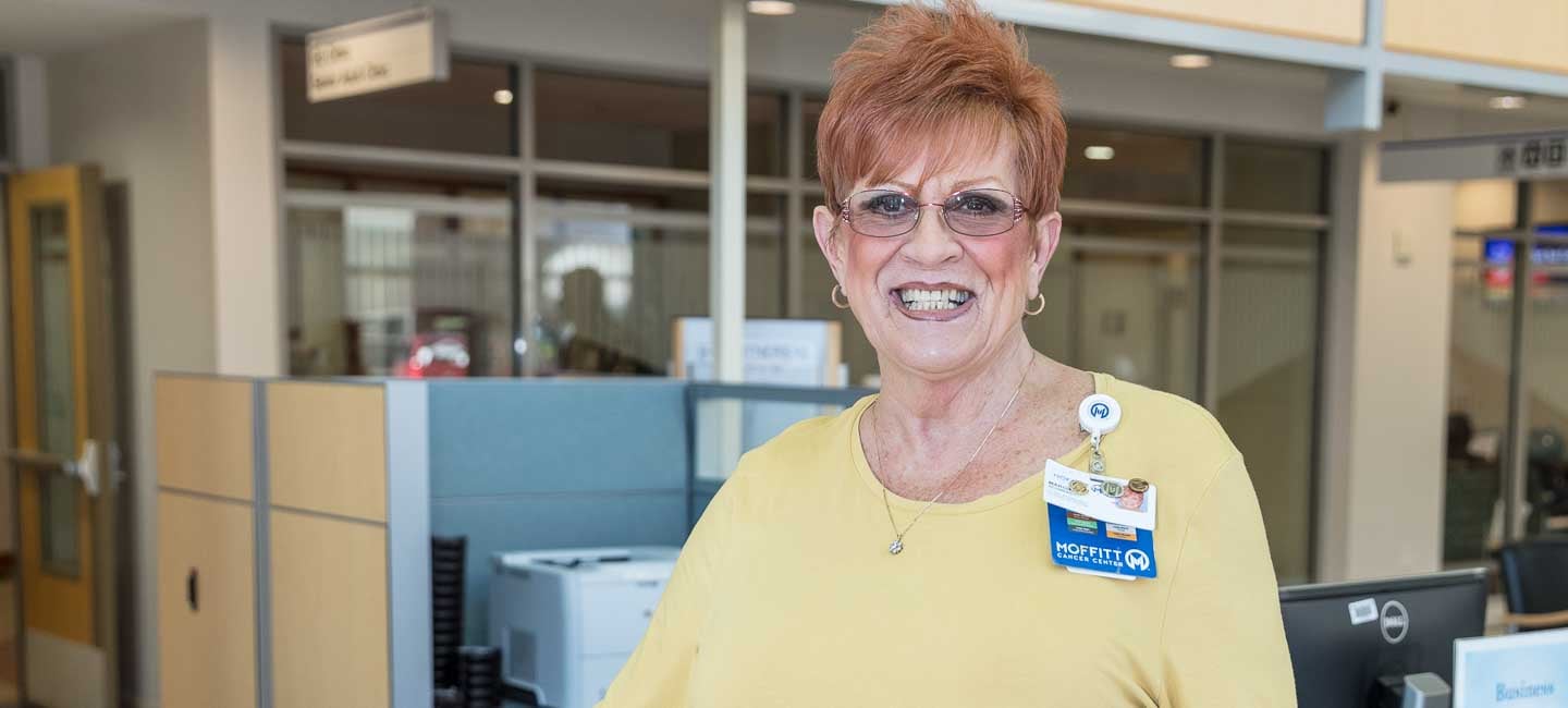 She’s the self-proclaimed "Walmart greeter" - the outgoing redhead who knows all things Moffitt and offers a reassuring smile to everyone she sees.