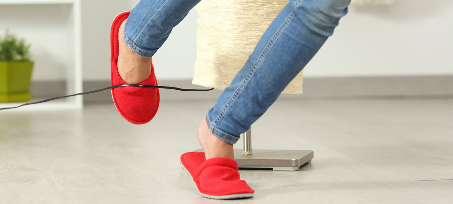 Footwear also plays a major role in preventing falls. High heels, fuzzy slippers and shoes with slick soles, such as flip flops, may lead you to trip, slip and fall. Be sure to wear sturdy shoes with nonskid soles. Properly fitting, sensible shoes may also reduce joint pain.
