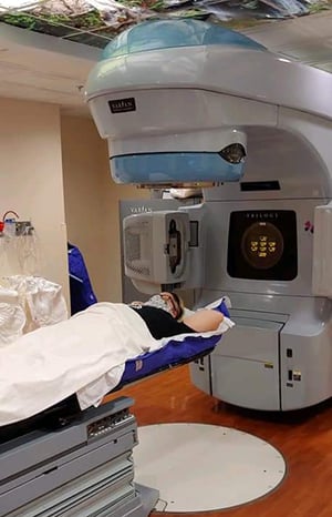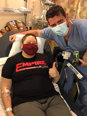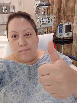 Jen Poblete-Scaglione gives the thumbs up before treatment at Moffitt.