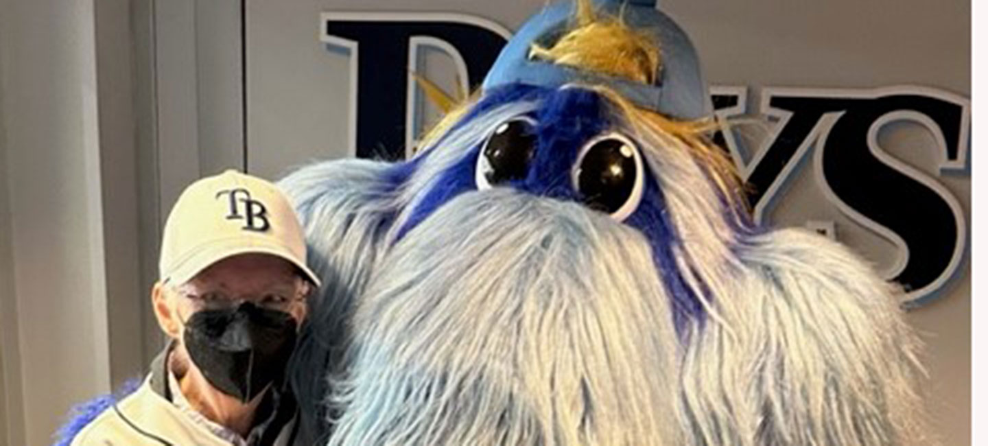 Her family surprised her with a special homecoming back to Tropicana Field on Sept. 23, 2023. The Tampa Bay Rays honored Dennis through the Salute to Survivors program. Her favorite mascot, Raymond, came by for a surprise visit and welcome-home hug.