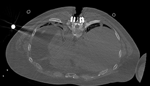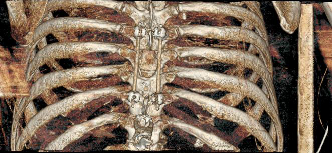 The carbon fiber material placed in Rob's back illuminate during a recent CT scan.