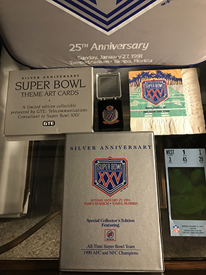 I was fortunate to have attended Super Bowl XXV on January 27, 1991! The Buffalo Bills lost to the New York Giants. Final Score: 20 – 19! This game was played when only ten days had passed since American military forces were deployed to Iraq, officially launching the Persian Gulf War. There was an eerie feeling over the “Big Sombrero” (Tampa Stadium) that day because of the war and MacDill Air Force Base being only a few miles away, but the crowd was inspired by the most patriotic salute ever: the now famous version of the national anthem sung by Whitney Houston! This rendition changed our expectations for the last 30 years as to how our anthem should be sung! The halftime show was New Kids on the Block. Photos are of my seat cushion and some commemorative cards of both teams, a Super Bowl XXV pin and of course, the first hologram game ticket … the cost of which was only $150!