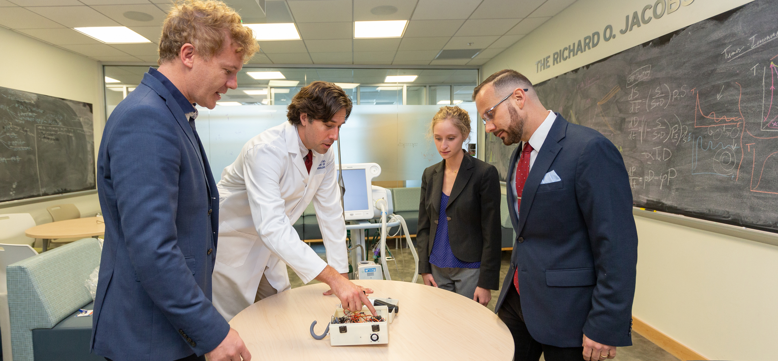 USF student Abby Blocker shows off the Eucovent prototype. She collaborated with Moffitt experts Dr. Stefano Pasetto, left, Dr. Heiko Enderling and Dr. Aaron Muncey to create the device, which has won first place at several competitions.