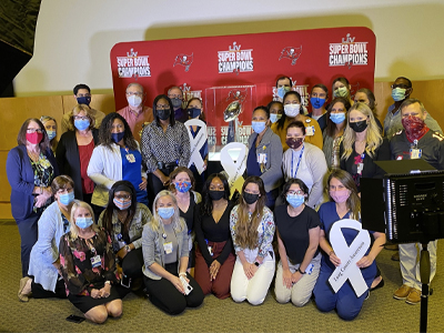 As part of the festivities, hundreds of Moffitt team members and patients, including many die-hard Bucs fans, lined the halls of the Stabile Research Building for a chance to snap a picture with their team’s latest Lombardi Trophy.