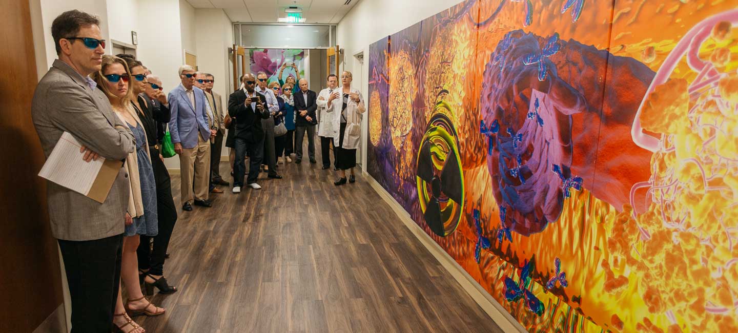 The 25-foot long piece of art is made up of panels that depict the different types of cancer treatment: chemotherapy, radiation, targeted therapy and immunotherapy.