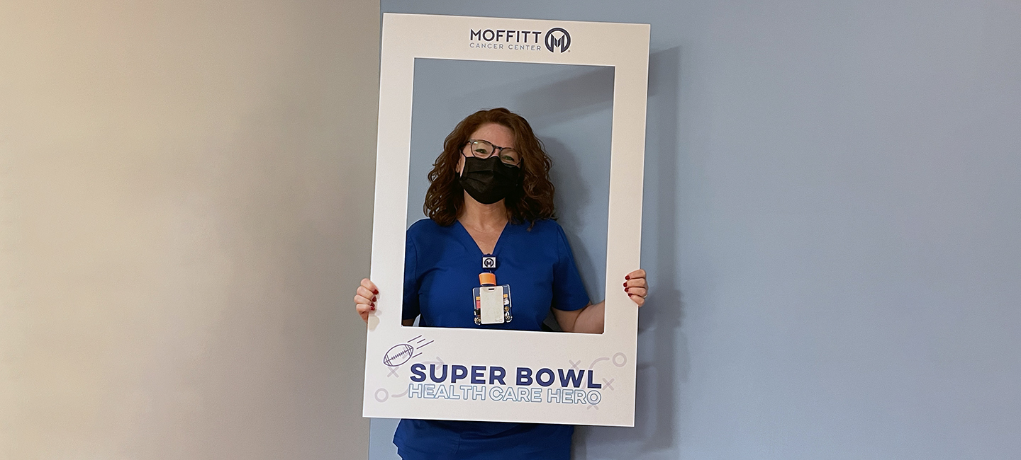I’m sure this has been a very challenging year for you and all your fellow Moffitt nurses. What does it feel like to be here today with an extraordinary opportunity to attend the Super Bowl?|Through this whole year and leading up to this moment, I think, like everyone, we're all shocked that we're still here moving forward and plugging along. I don't think anybody could have predicted the events of the past year. But to be offered an opportunity like this, it’s mind-boggling.