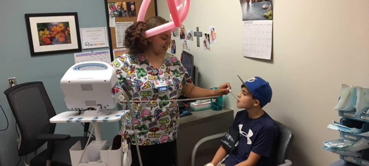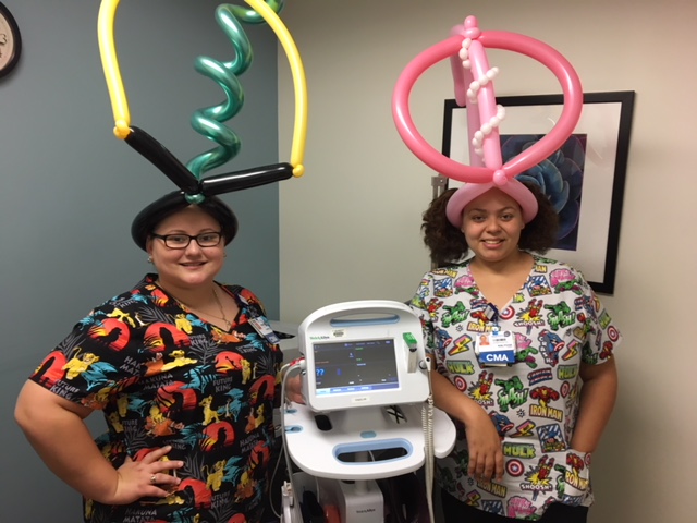 As the person who’d be recording their vital signs, Guzman wanted to be sure she was in the spirit – from her scrubs right down to the crazy hat created for her by a balloon artist entertaining the young patients.
