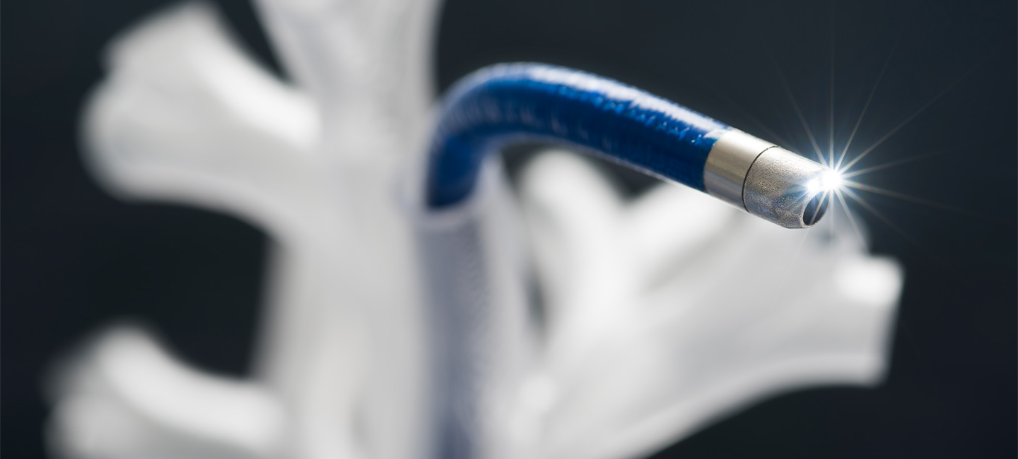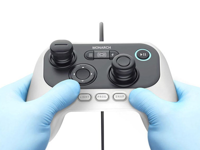 This new robotic bronchoscopy platform uses what looks like an Xbox videogame controller to navigate a flexible bronchoscope to the periphery of the lung with improved reach, vision, control and accuracy for biopsy of small lung lesions. This technology combines traditional bronchoscopic views into the lung with computer-generated navigation based on 3D models of the patient’s own lung.