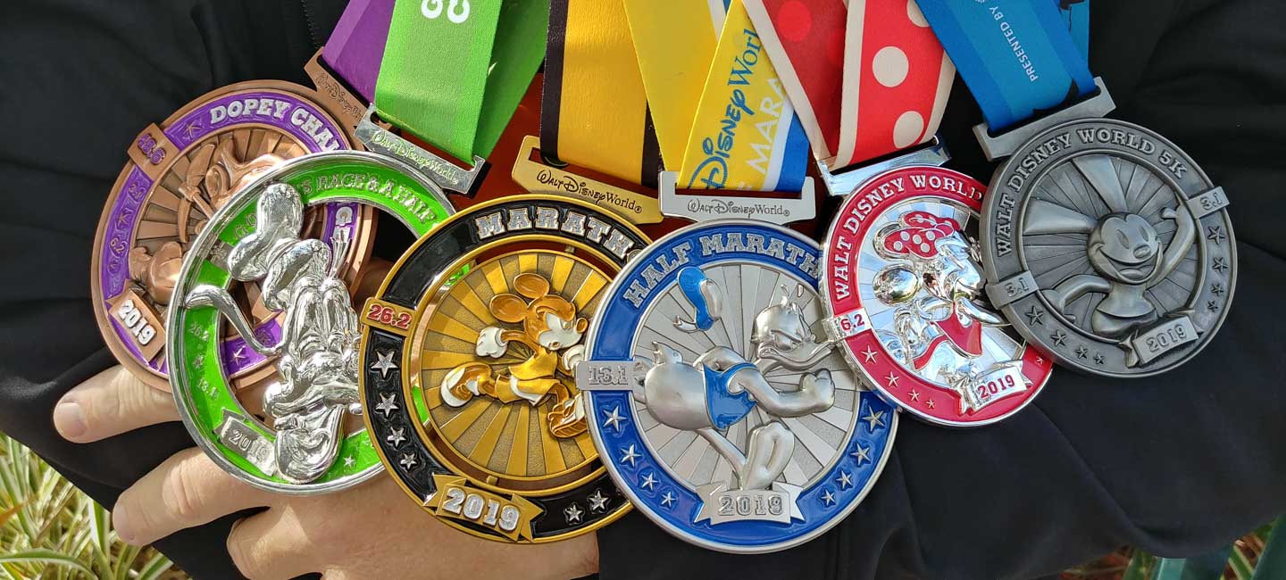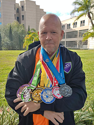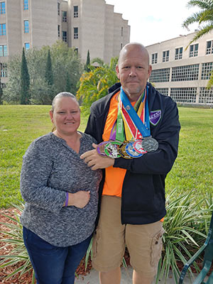 Ron Wertley poses with his Disney Dopey Challenge medals in front of Moffitt Cancer Center.