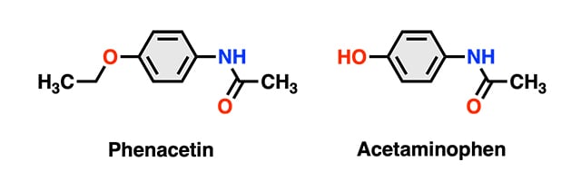 The reason behind California’s move to label acetaminophen as a carcinogen may be its close relationship to phenacetin. Phenacetin is an analog of acetaminophen that was also used as a pain reliever for nearly a century before the FDA banned the medication in 1983 for concerns with its carcinogenic properties, as well as its negative effects on the kidneys. The diagram shows that the chemical structure of the two are very similar, differing only in one group. Importantly, phenacetin extensively metabolized to acetaminophen in our body and minor metabolites are likely responsible for the reported toxicity.