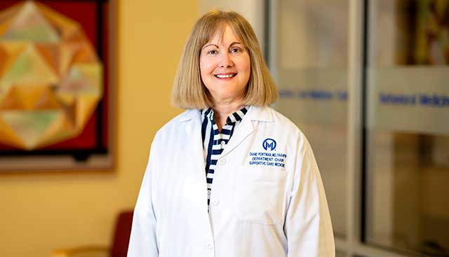 The Supportive/Palliative Care Medicine section is led by Portman, who is credentialed in anesthesiology, pain management and palliative care medicine. With six physicians and five advanced practice nurses, this section provides pain and symptom management throughout the course of illness to improve comfort, quality of life and daily function. The section’s social worker and a designated chaplain offer emotional, spiritual and practical support for adjusting to life with a serious illness. Team members also help patients with transitions of care and advanced care planning. They are specially trained to clarify patient goals of care in order to help teams provide treatments that best align with what patients express is most important to them.