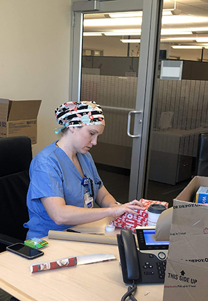 One of Moffitt's "elves" hard at work wrapping gifts.