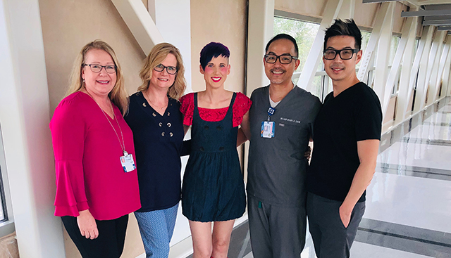 WHERE IT ALL STARTED – Patient Danielle DeCleene (center) was the first to share her story and inspire Moffitt researchers in an informal visit to the lab of Dr. Eric Lau (far right). Danielle was being treated by acupuncturist Dr. Liem Le (second from right) for pain related to her melanoma and expressed interest in learning about Moffitt’s melanoma research. Le arranged her visit to husband Lau’s lab, and the resulting emotional exchange became the basis for monthly Patient Researcher Forums. Moffitt’s Patient and Family Advisory Program Manager Anne Bidelman (far left), and her predecessor in that role, Kim Amtmann-Buettner (second from left), help to identify and connect patients to participate in the forums.