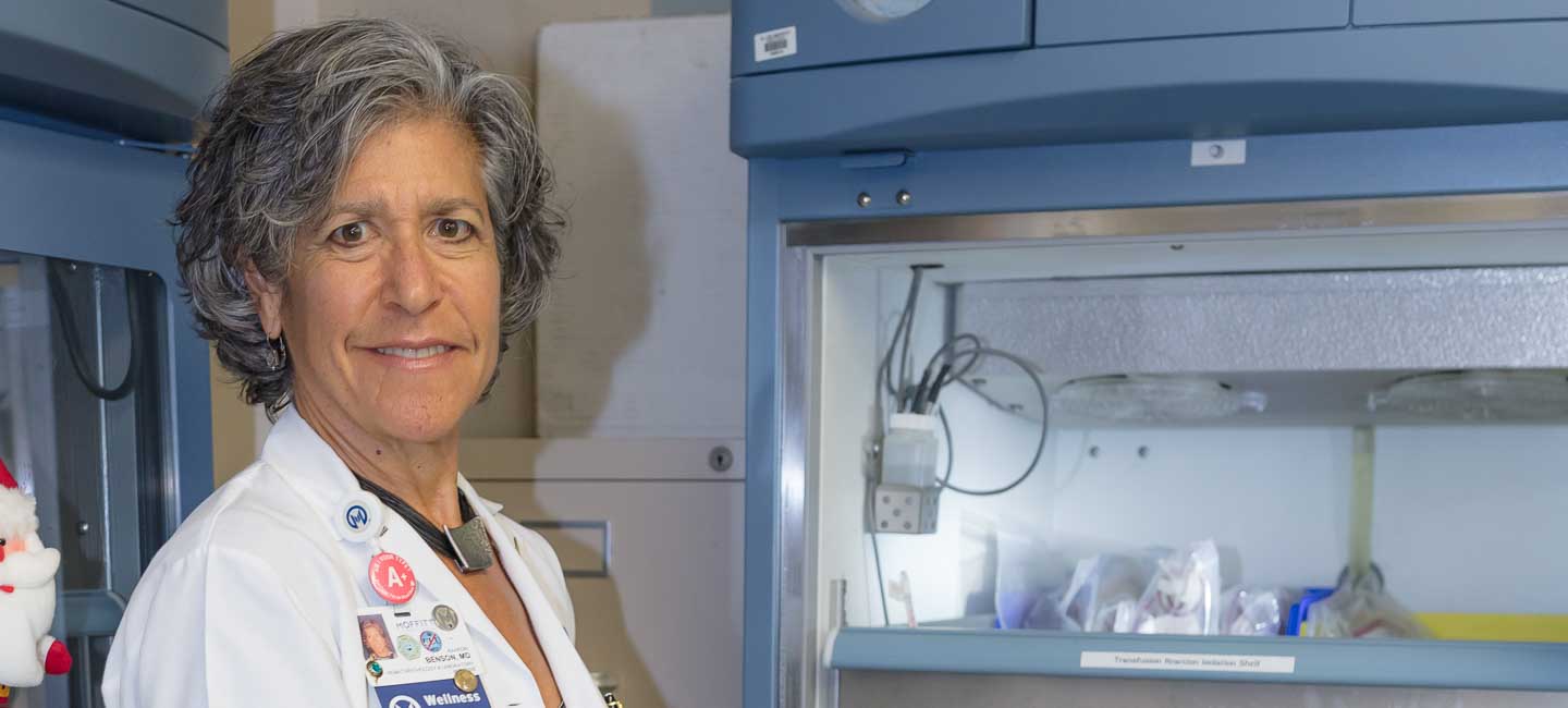 Spend a little more time, and you will learn how the complexities of transfusion medicine tie in with quality patient care. Delve further and you will meet a passionate patient-focused doctor, teacher, mother, energetic cyclist for a cause and a warm, sociable strong woman. Photos of her daughters and friends, along with memorabilia from her travels, grace her office walls and credenza.