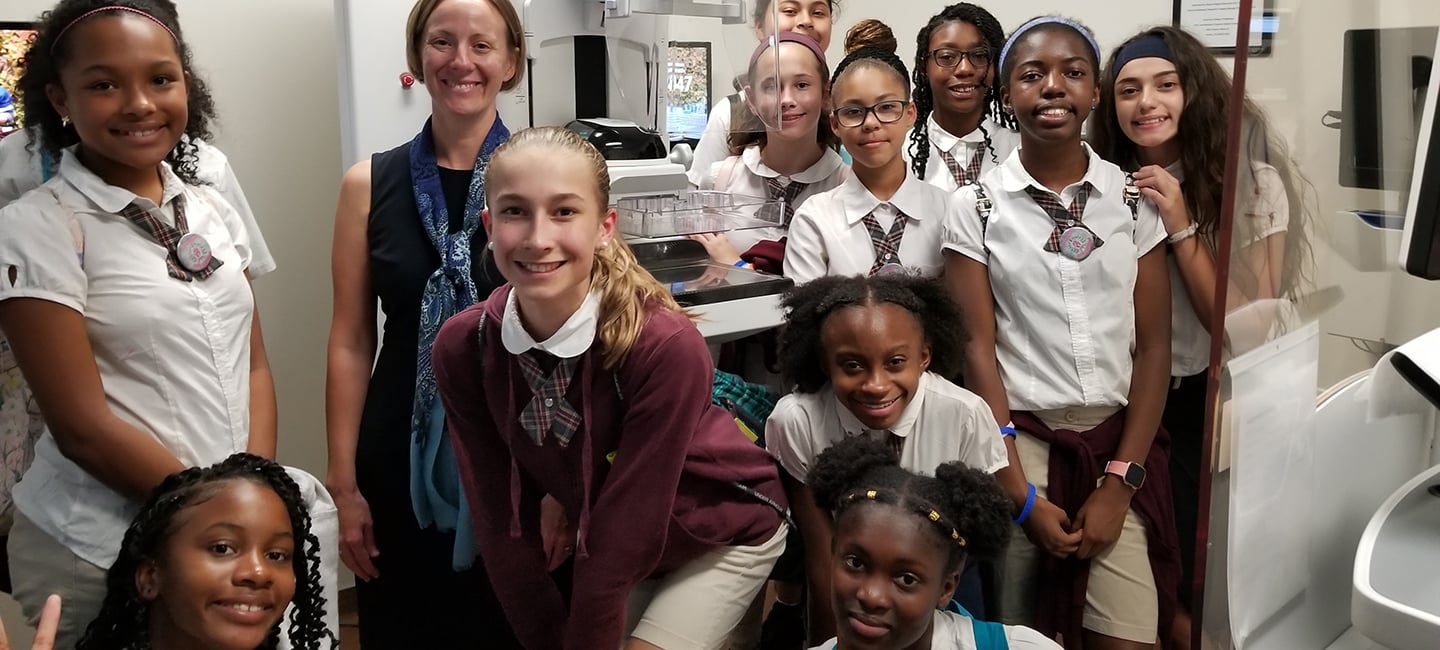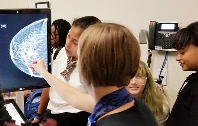 “The most important thing we can do for school-age kids through the Healthy KIDZ program is encourage them to take care of themselves, their family members and their friends,” said Bethany Niell, MD, PhD, Moffitt’s division chief of breast imaging. Niell spoke to nearly 100 students from Franklin Boys Preparatory Academy Middle School, Ferrell Girls Preparatory Academy Middle School and Redlands Christian Migrant Association Leadership Academy about mammography screenings and explained how the equipment can help save lives.