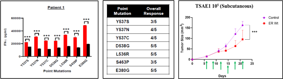 In patients that develop metastatic HR-positive breast cancer about 40-50% develop resistance to anti-estrogen therapy mediated by mutations in the ESR1 receptor. Moffitt investigators have developed neoantigens from seven mutated regions that result in CD4 Th1 responses that are stronger than immunogenic wild-type peptides that have been identified in ESR1. The results from patient #1 and the overall responses from five patients are shown below. Within the wild-type ESR1 four peptide epitopes were identified that routinely drive Th1 response. DC1 Dendritic cells were pulsed with these wild-type ESR1 peptides ex vivo and then were administered intratumorally twice a week for three weeks in tumor bearing Balb/C mice. Results show a significant delay in tumor growth using WT-DC1 vaccines (Fig). In addition, about a 12% of complete regression in these mice were observed. These results were quite exciting to us and suggest that mutations in ESR1 can lead to neoantigens driving a CD4 Th1 response that can also be used to potentially direct antibody responses and CD8 T cell cytotoxic responses.